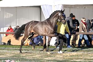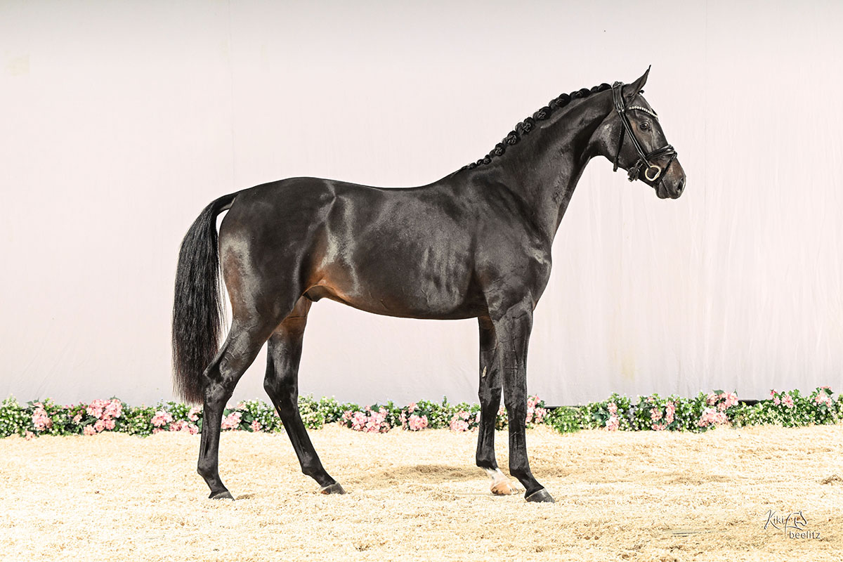 Dazu verfügt dieser Strahlemann über ein ausgesprochen edles und blutgeprägtes Exterieur mit modernem Outfit und korrektem Fundament von unglaublicher Eleganz und Ausstrahlung. Ein bildschönes Gesicht mit einem großen wachen Auge, sehr gut aufgesetzter Halsung, schräger Schulter , ausgeprägtem Widerrist und guter Sattellage, einer schönen Oberlinie mit guter Verbindung in den Lenden, einer langen gut bemuskelten Kruppe und einem perfekt gewinkelten Hinterbein. In den Grundgangarten überzeugt VERTIGO durch seinen überragenden, raumgreifenden und taktklaren Schritt, im Trab kräftig aus dem Hinterbein unter den Schwerpunkt abfussend bei viel Schulterfreiheit und einer perfekt bergauf und tief unter den Schwerpunkt gesprungenen Galoppade. Bei den ersten Versuchen unter dem Sattel erweist sich dieser bildschöne Hengst als sehr gelehrig und leistungsbereit, so dass es jeden Tag eine grosse Freude ist mit ihm zu arbeiten, was auch auf sein grossartiges und menschbezogenes Interieur schliessen lässt. Wir freuen uns, dass wir diesen Ausnahmehengst auf unserer Station den ambitionierten Dressurpferdezüchtern anbieten können und freuen uns jetzt schon sehr auf seine ersten Nachkommen im Jahr 2027.